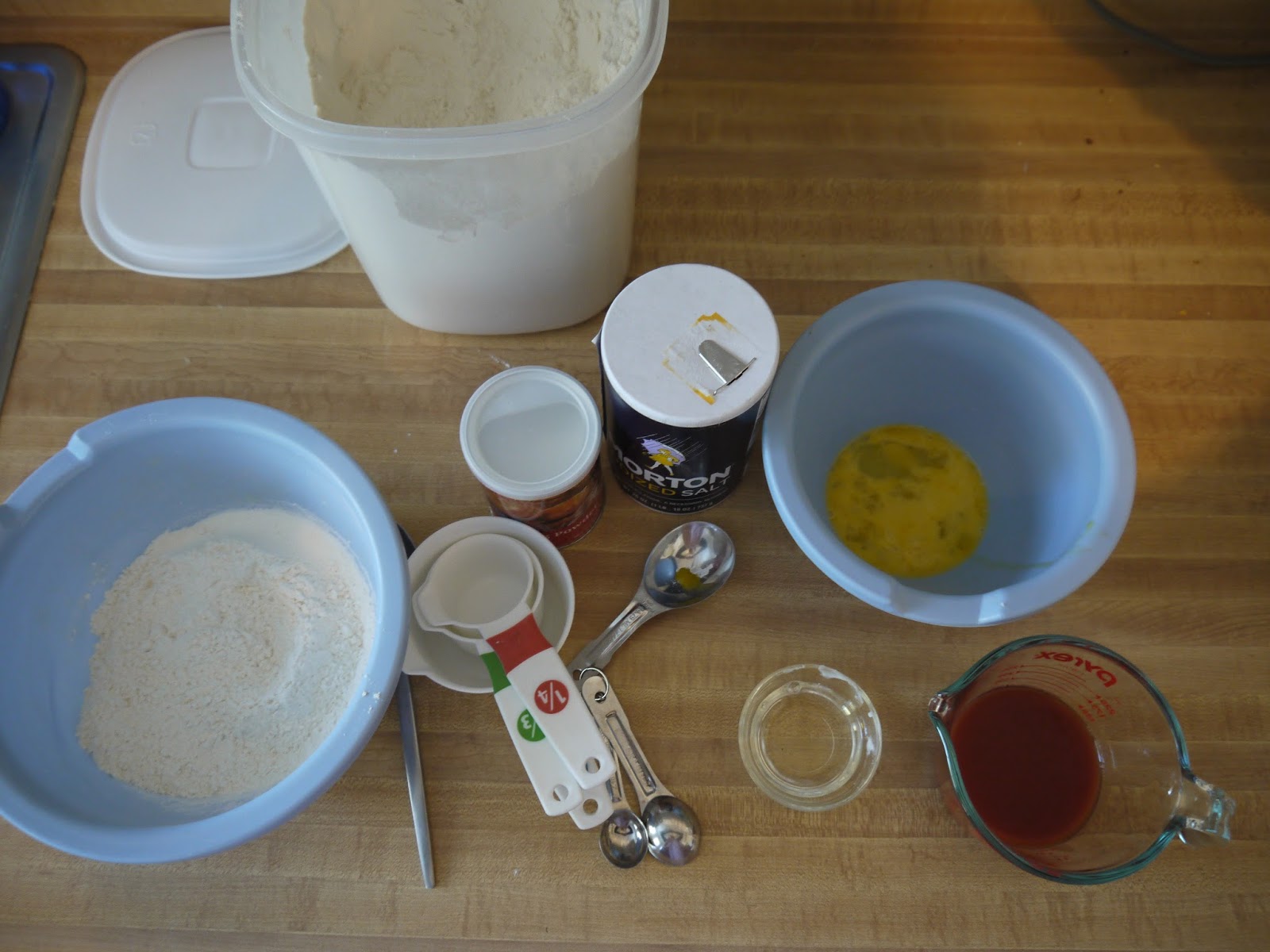 Sift together flour, salt, and baking powder. Combine egg, melted fat, and tomato juice. Combine mixture with dry ingredients, stirring only until flour disappears.